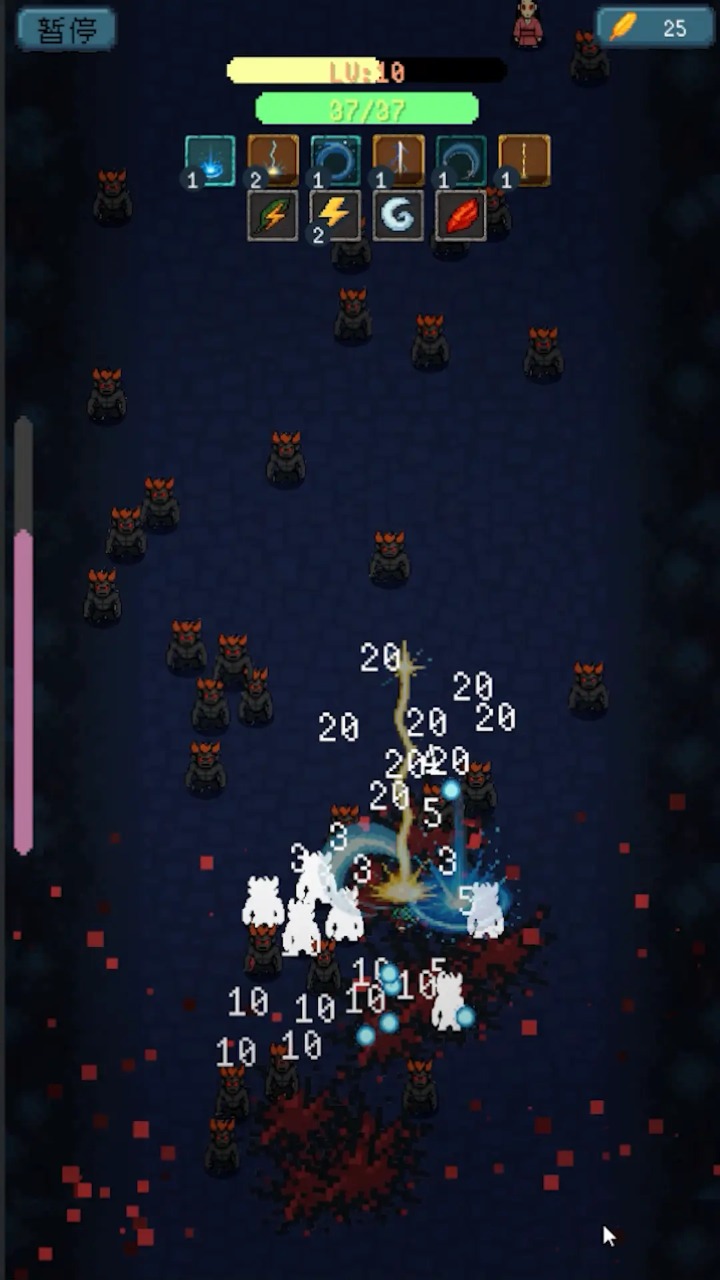 6:继续在战斗中使用技能和武器,击杀敌人获取经验和资源(如右上角的黄色道具),提升等级(如LV:10),解锁更多技能和装备,增强角色的战斗力,应对更强大的敌人。