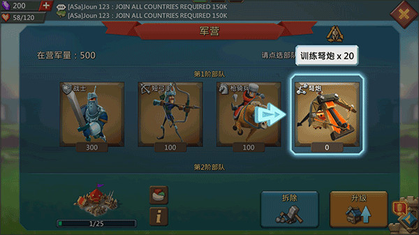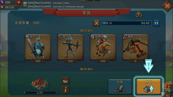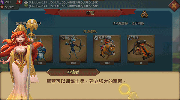 1、下载安装好王国纪元,打开游戏,点击军营训练士兵,建立起强大的兵团。