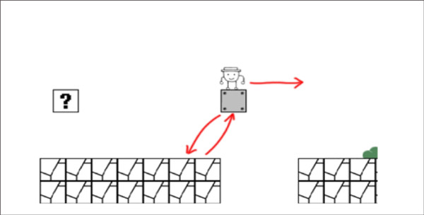2、这时候大家跳一下,第一个机关就会出现了,大家可以直接跳到“?”的砖块上,然后再在边缘处跳出第二个机关。跳到机关上再向右跳,不过此时大家要把握好距离,游戏中所有的云都是带“刺儿”的。