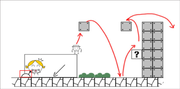 1、已经入本关同样看到了与第二关一样的大牌子,一定要相信这里的哈,玩家要从上边走,不然上边的砖块就会掉下了(这是什么逻辑,唉),大家还要注意的是,跳到砖块上还要继续再跳一下,否则你会被飞来的导弹给炸掉。