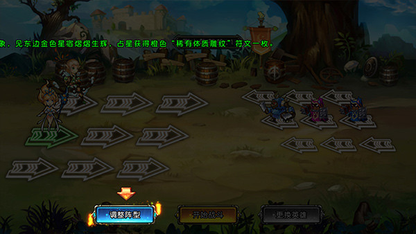 4、进入游戏之后,我们需要战斗的阵型进行调整,将游侠移动到最前方,然后点击开始战斗;