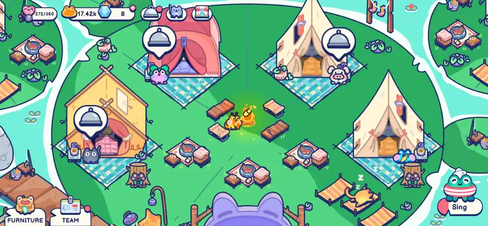 3、玩家进入游戏主界面后即可布置帐篷、烹饪料理、吸引访客,并逐步解锁更多角色和活动。