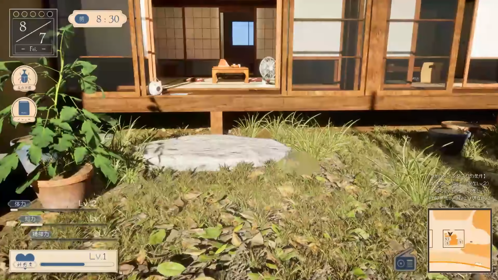 4、好感度达到一定等级后可解锁跟随功能,允许带夏风外出探索。游戏中设有昆虫收集支线,不耗时间且可获得服饰奖励。