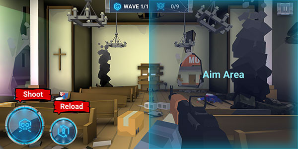 2、进入关卡后,拖动右侧屏幕可以移动准星,左侧为开火和换弹按钮。