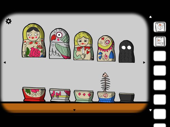 7、点击柜子中的套娃,依次将它们摆出来。在黑影套娃里是花,把花移到女人套娃上合住,再打开就是鱼,以此类推,最后得到钥匙。
