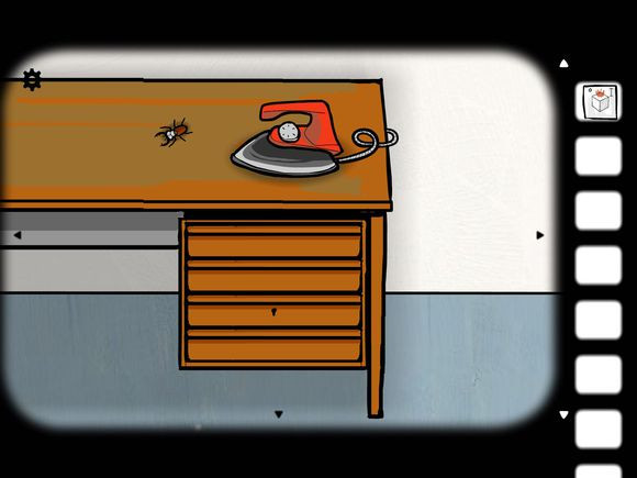 4、残忍的一幕要来了,点桌子切换到熨斗场景,点熨斗抬起,在点击小虫让它走过去……