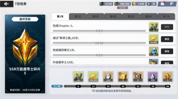 在「7日任务]里面给你们安排了超级丰厚的奖励,有黑水晶以及抽卡资源!达成最终目标,还可以获得5个「SSR万能碎片]!