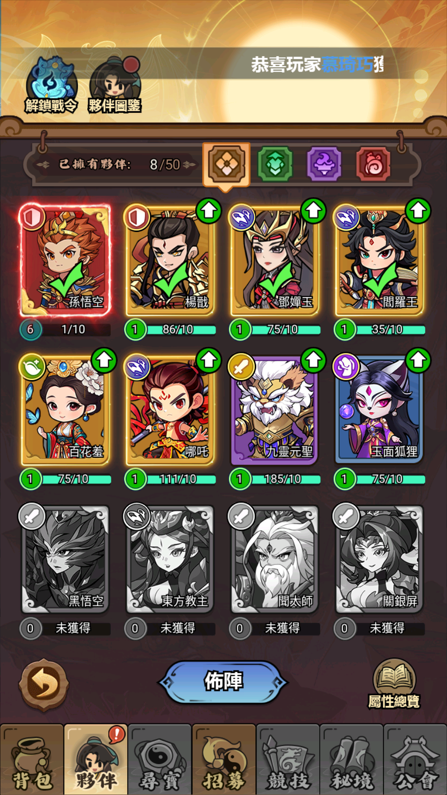 1、游戏有着很多神话角色,比如孙悟空、杨戬、邓婵玉等,全部都能自由组队。