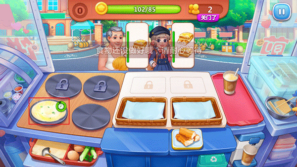3、在做煎饼时,右上角的绿色圆圈表示它快要成熟的时间,如果变成了红色圆圈,就表示快要烧焦的时间。你只要在它立马变成红色圆圈时那个客人即可。你只要每天赚到一定数量的金币就可以关门啦!