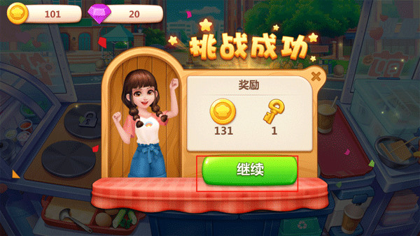 3、满足客人需求后,就可以挑战成功,之后,获得【金币】和【钥匙】后继续挑战