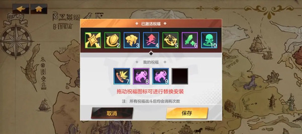 -冒险者最多可以同时激活7项祝福,此外还可额外保存4个祝福,在开始战斗前可以任意替换使用;祝福有消耗次数限制,所有已激活的祝福在战斗后均会消耗次数。
