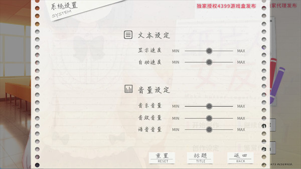 进入游戏后建议先调整基础设置:将文本速度设为适中,避免影响阅读节奏;语音音量可适当调高以增强沉浸感,背景音乐与音效可根据个人喜好自由调节。如设置不理想,可通过重置按钮一键恢复默认状态。