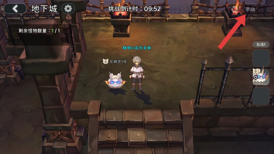 2、进入地下城后,留意界面中的【挑战倒计时】与【剩余怪物数量】;点击【手动】按钮将其切换为自动模式,启动与怪物的战斗。