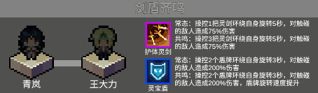 常态:操控2个盾牌环绕自身旋转3秒,对触碰的敌人造成200%伤去