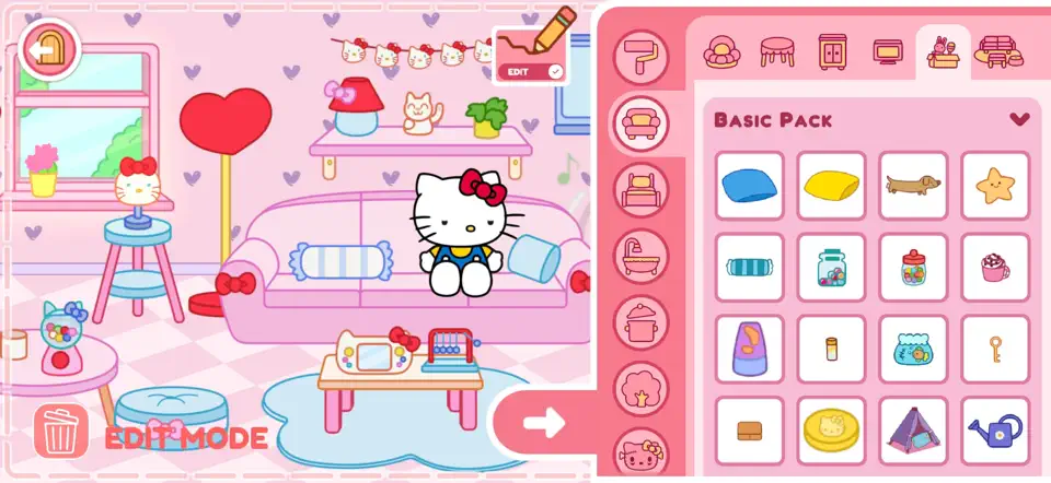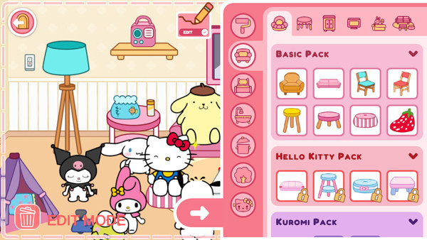在凯蒂猫生活世界里,你可以建造和装饰各种主题房屋,比如 Hello Kitty 的家、酷洛米的家、布丁狗的家……甚至是充满节日气氛的圣诞节小屋或惊悚刺激的万圣节小屋——随心所欲地搭配组合!