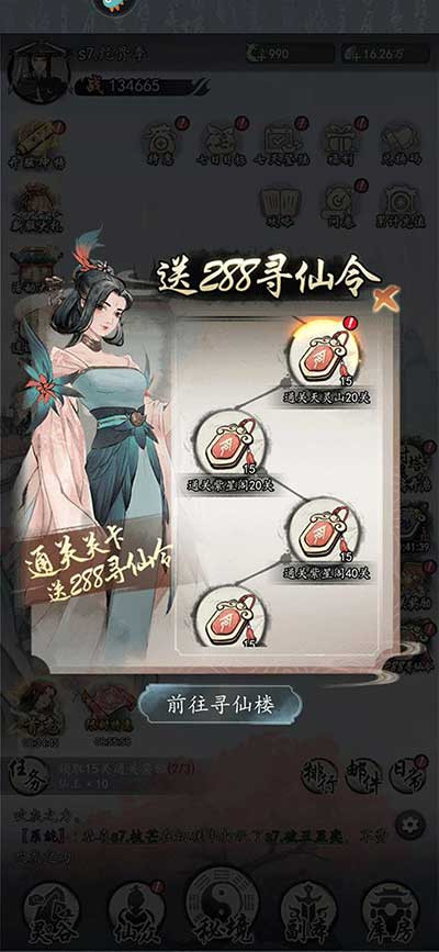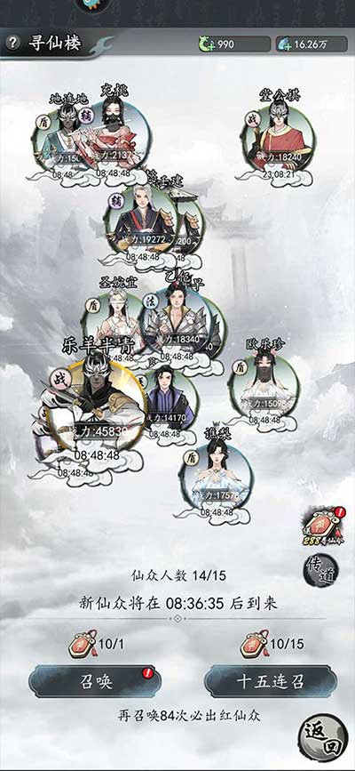 4、寻找楼招募仙众,招募到不想要的可以进行传道,传道会获得对应仙众之魂,仙众也会消失,仙众之魂用于仙众进阶,可以让角色战力飙升;