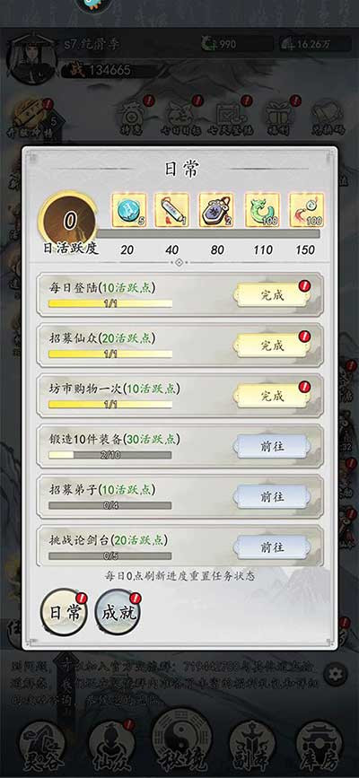 10、任务板任务尽量刷高阶的,声望奖励多,声望可以提升宗门等级,宗门等级越高开放的功能越多,涨战斗越快;