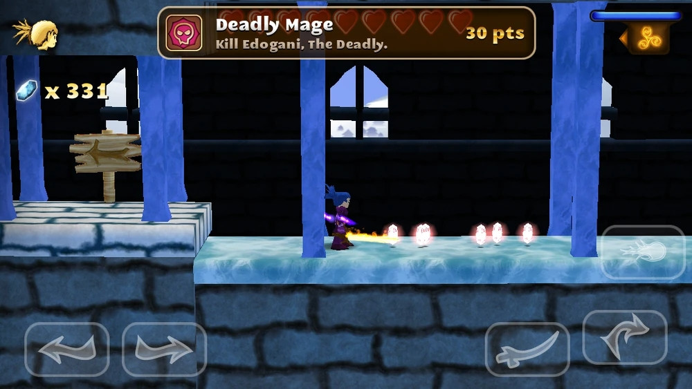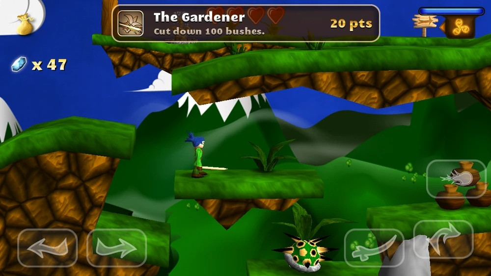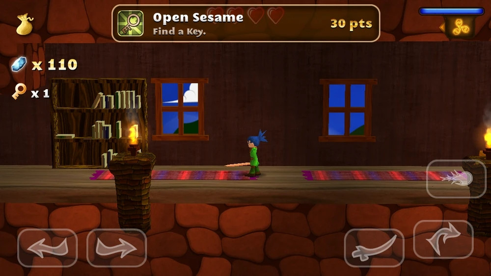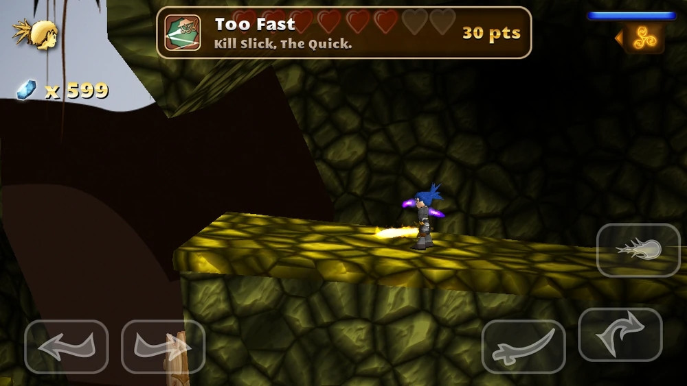 剑客少年游戏设有虚拟按键,如上图左下角分别有左右两个按键,玩家只要进行点击即可完成相应动作。双击两下方向键即可使人物进入奔跑状态。