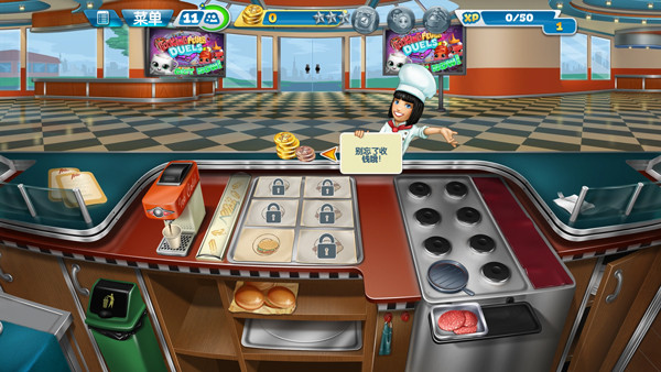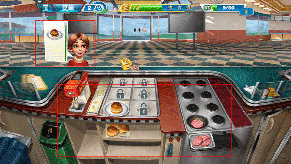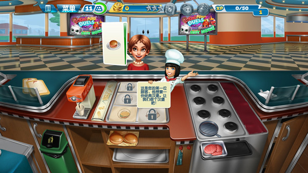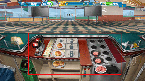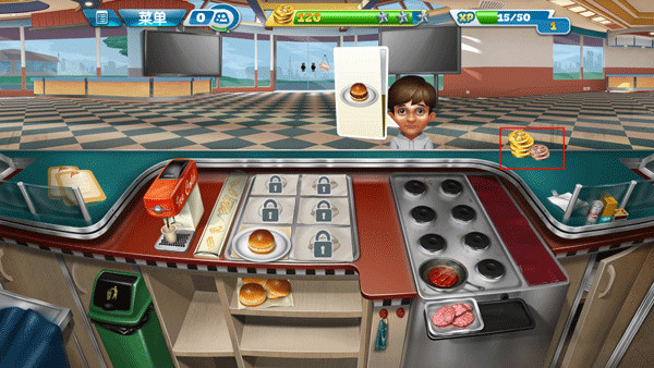 1、打开烹饪发烧友2026游戏,进入关卡1。根据客人的口味,选择汉堡包,然后将牛排放入到汉堡包里面,最后将食物递给顾客。顾客吃到自己想要的食物,就会给与金币和小费在桌子上,你需要点击桌子上的货币来获取。
