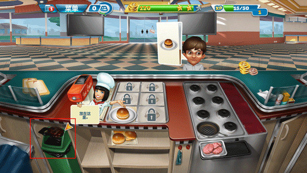 2、当你制作的牛排已经烤焦了,可以点击牛排并将它移动到垃圾桶里面。你需要完成关卡开头给与你的目标指数,这样就可以达成今天的业绩要求了。