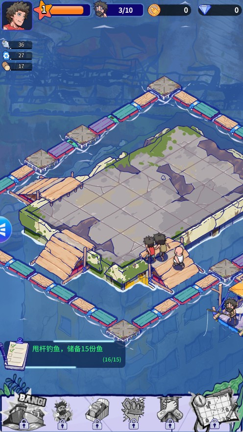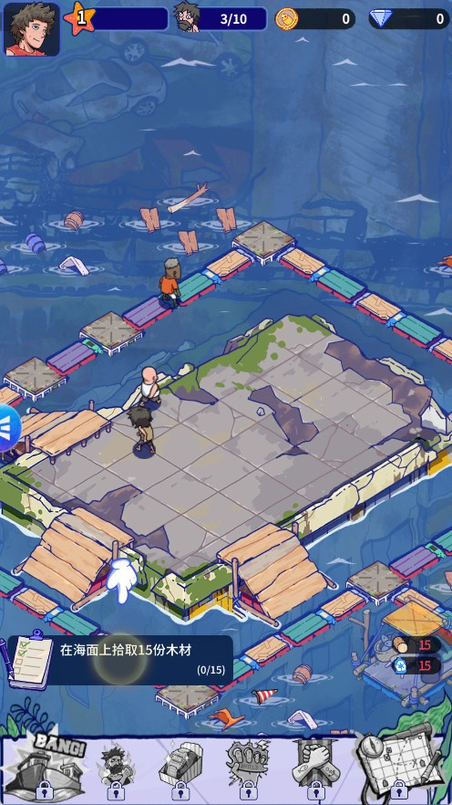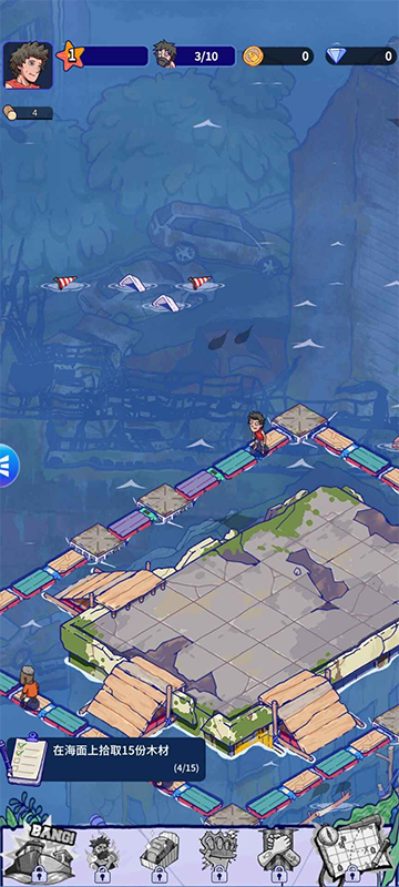 1、疯狂水世界游戏初始阶段资源少,第一目标就是收集漂浮资源,木板、绳索、金属、塑料。