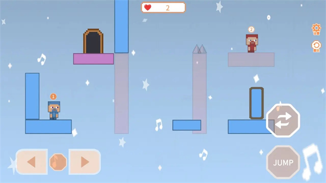 1、游戏内的工坊以跳跃为主,合作通关,类似玩法有小时候的森林冰火人,只不过玩家人数可以更多,有1、2、4、8人四种,玩法也更多样化,工坊图为玩家制作。