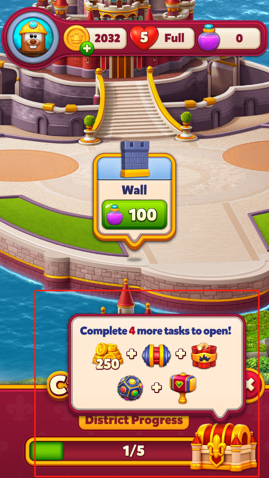 4、除了三消解谜,你还可以通过完成关卡赚取金币,解锁和建造王国的不同区域
