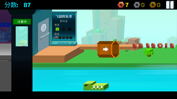 2、飞跃鳄鱼潭:抓准发射筒角度变化的时机,点击屏幕将小怪兽发射至终点。