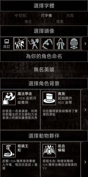 3、创建角色时自定义字体、头像与名称,选择“贵族”背景获额外金币,搭配“吸血蝙蝠”伙伴增强生存能力。