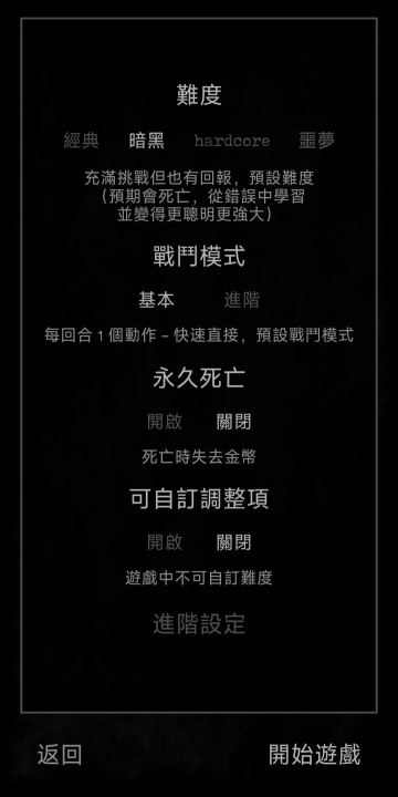 2、进入难度设置界面,选择“暗黑”模式与“基本”战斗,可开启永久死亡机制增加挑战性与策略深度。