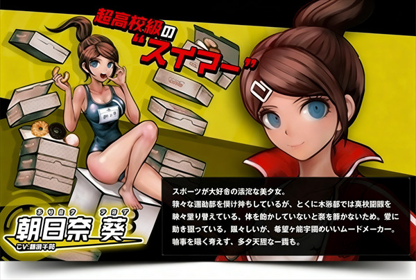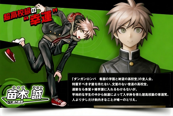 一代的主人公,唯一一个由随机抽取的方式进入希望之峰学园读书的学生,因为被称为“超高校级的幸运”,不过由于其入校后厄运不断,被黑白熊吐槽应该是“超高校级的不幸”。