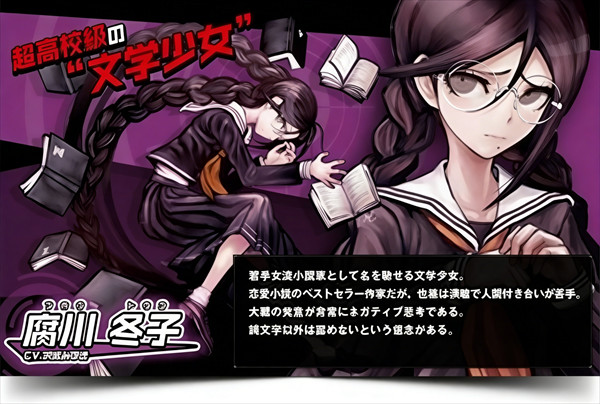 以年轻女性小说家的身份闻名的文学少女,擅长写恋爱小说,代表作《矶香消逝时》曾一度引起了社会现象。集腐女痴女丧女抖M女于一身,跟踪狂且有很严重的被害妄想,能够一个月不洗澡。痴迷于十神少爷。非常讨厌宅元素。有双重人格。