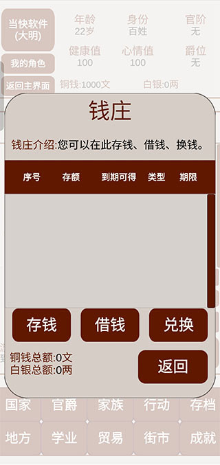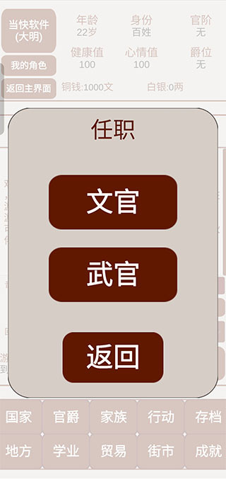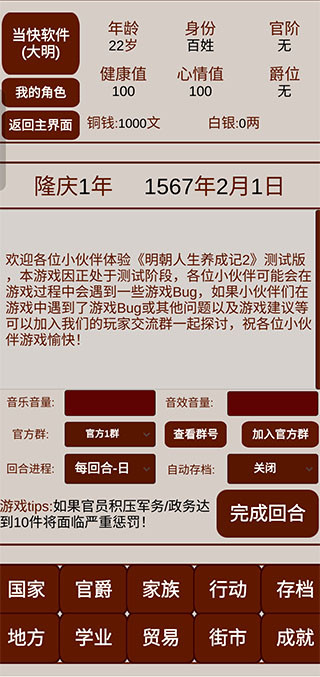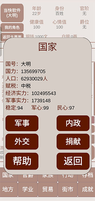 4、进入主界面后,国家、官爵、家族、行动、存档、地方、学业、贸易、街市都是可以供玩家经营的。