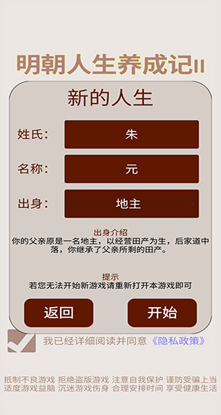 1、首先进入明朝人生养成记2完整版游戏,点击新的人生;