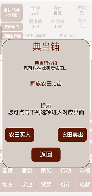 3、拿到俸禄后优先买低价田产,九月十五记得耕种收粮,卖粮换钱再继续买田,形成循环,正常年份回报稳定,是最可靠的长期收入方式。