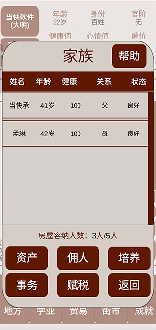 1、明朝人生养成记2完整版前期最重要的是不死,健康值和心情会持续下降,断粮会让全家状态迅速崩盘,99%的早期死亡都源于这两项清零,没钱不会直接死档,及时去医馆和戏院即可回血回心情。