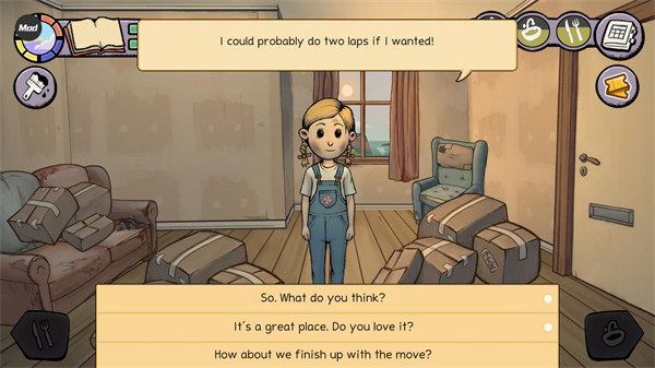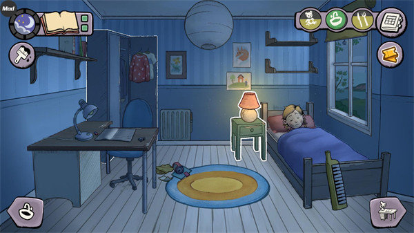 5、通过左下角和右下角的切换按钮,可以进入不同的生活场景,如卧室、厨房、客厅等,每个场景都有不同的互动选项与养育功能。