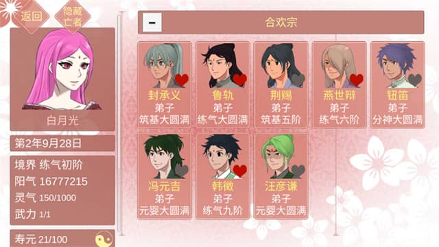 提示:前提是心变成红色的才可以一起修炼,灰心要先增加感情,送礼物可以增加好感
