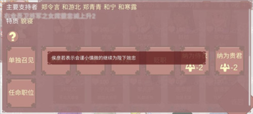 4、循环后臣子的职位等级已经变低了,再提到原有的位置时又会有因升职而增加的忠诚度,基本循环一两次就可以完成一百忠诚。