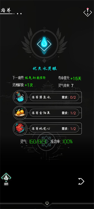 4、灵州注灵的材料和修士升级材料一样,游玩过程中推荐优先给修士升级,当修士的等级到达第一次突破境界的时候,开始给灵州注灵。