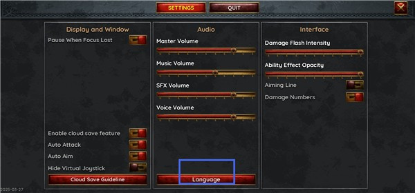 1、进入苦痛殿堂手机版游戏后若界面不是中文,可先点击屏幕中的角色头像或人物图标进入设置入口。