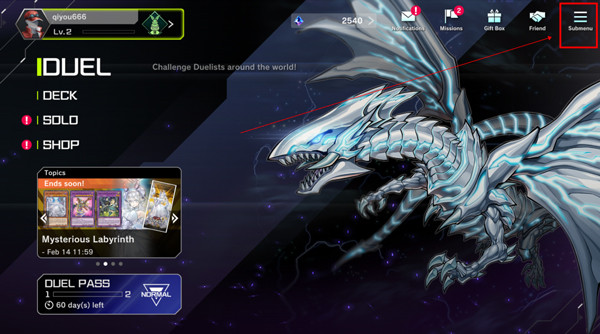 1、打开masterduel手机端,进入游戏之后点击右上角Submenu;