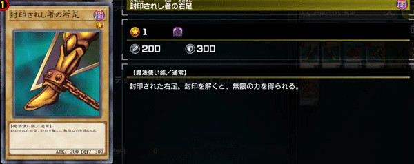 效果:这张卡和「被封印者的右腕」「被封印者的左腕」「被封印者的右足」「被封印者的左足」在手卡全部齐集时,自己决斗胜利。