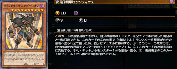 效果:这张卡不能通常召唤。「与艾克佐迪亚的契约」的效果才能特殊召唤。①:这张卡不会被战斗以及魔法·陷阱卡的效果破坏。②:自己准备阶段发动。这张卡的攻击力上升500。③:自己墓地是「被封印的艾克佐迪亚」「被封印者的右腕」「被封印者的左腕」「被封印者的右足」「被封印者的左足」的其中任意种不存在的场合这张卡破坏。