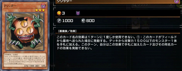 效果:这个卡名的效果1回合只能使用1次。①:这张卡从场上送去墓地的场合发动。从卡组把1只守备力1500以下的怪兽加入手卡。这个回合,自己不能作这个效果加入手卡的卡以及那些同名卡的发动。