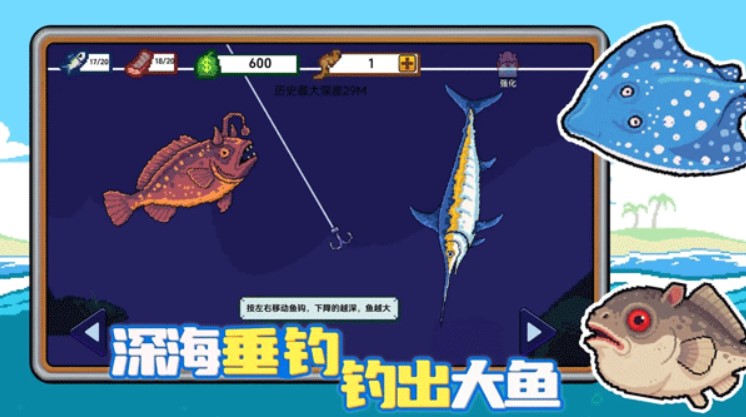 3、轻松欢快的创意钓鱼挑战带来更好玩的钓鱼体验,随着游戏的推进,玩家可以探索更深的海底,获得更多的奖励。