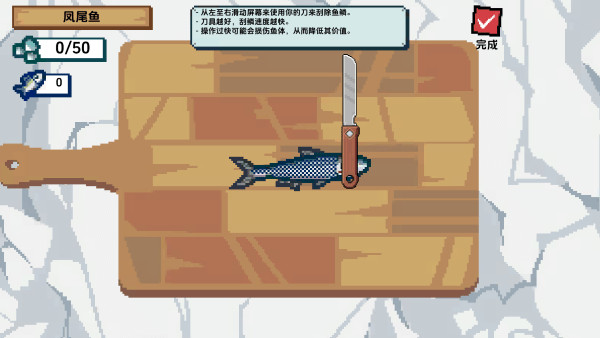 4、从左到右滑动屏幕来使用你的刀刮鱼鳞。道具越好,刮的越快,同时也不会伤了鱼体,价值也会越高。