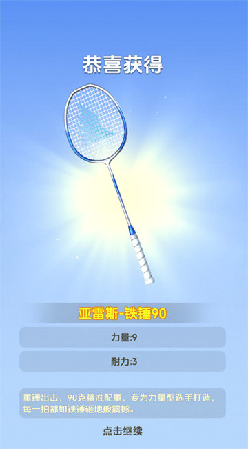 通过羽毛球对决的一些关卡后能够解锁更多球拍,比如通过第一关后可以解锁亚雷斯-铁锤90