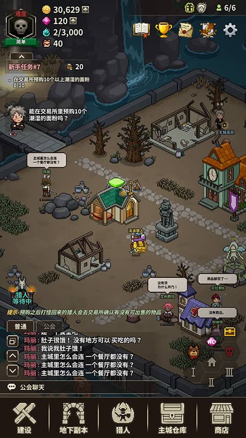 1、打开猎魔村物语中文版游戏,进入游戏主界面,在下方包括【建设】、【地下副本】、【猎人】、【主城仓库】和【商店】选单,