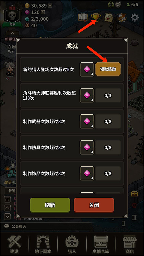 11、选择上方【奖杯】图标,可查看各种成就的要求,完成后可领取相应的奖励,